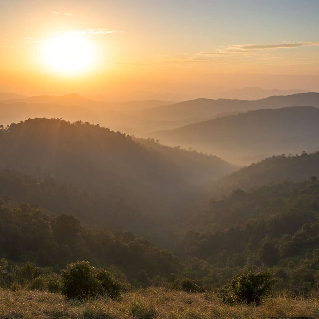 Golden Sunset Over Misty Mountain Hills
