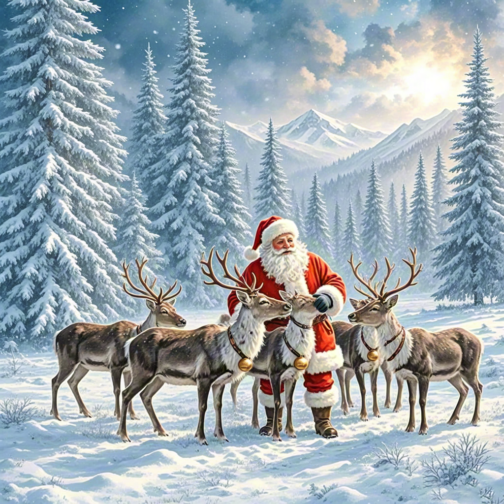 Santa and Reindeer Winter Scene
