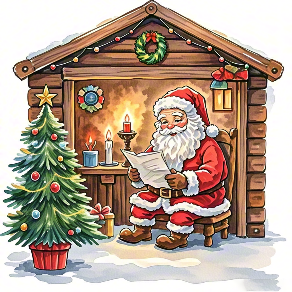 Santa reading letter in cozy wooden house