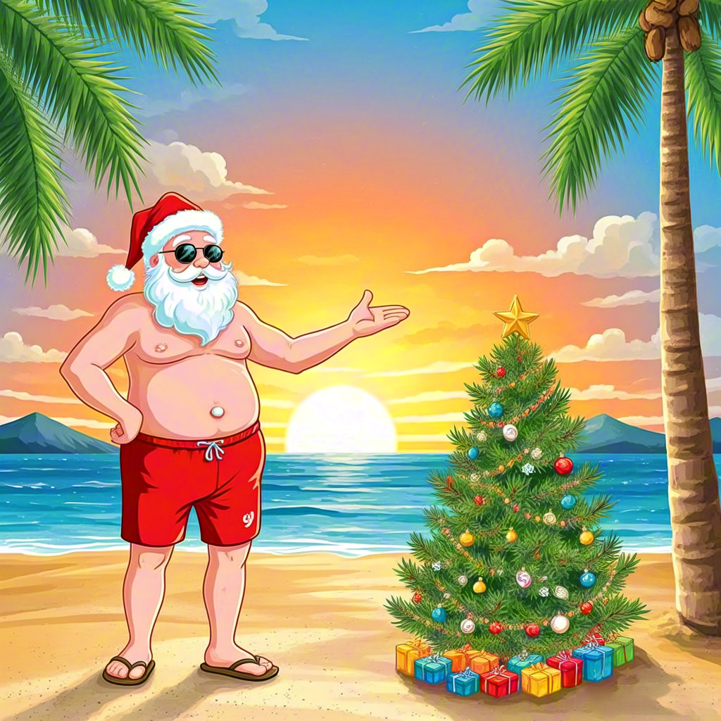 Tropical Christmas Santa on Beach Illustration