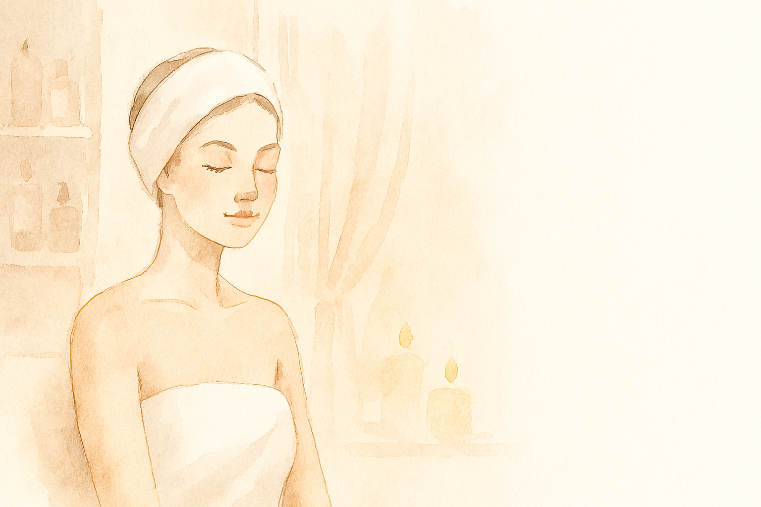 Soft watercolor scene of a woman relaxing in a warm spa environment.