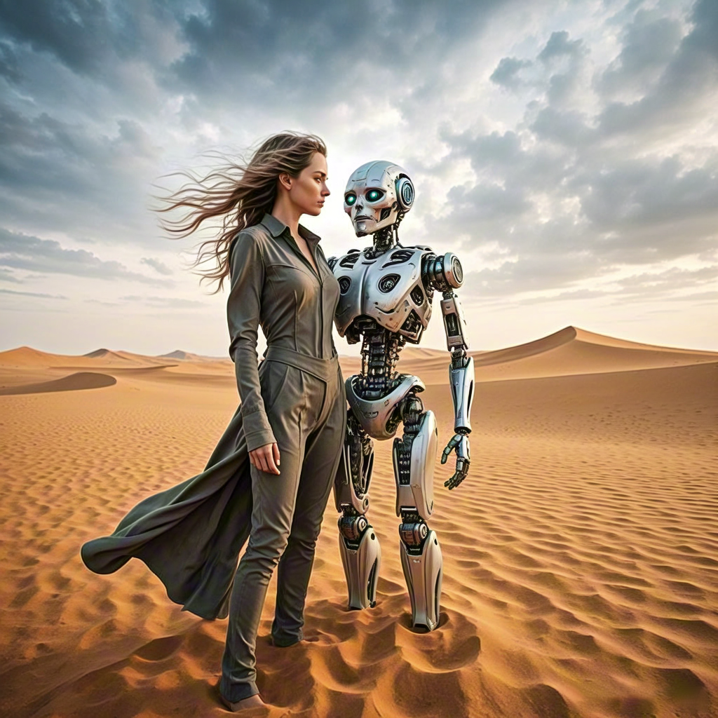 Woman Holding Hands With Robot in Desert
