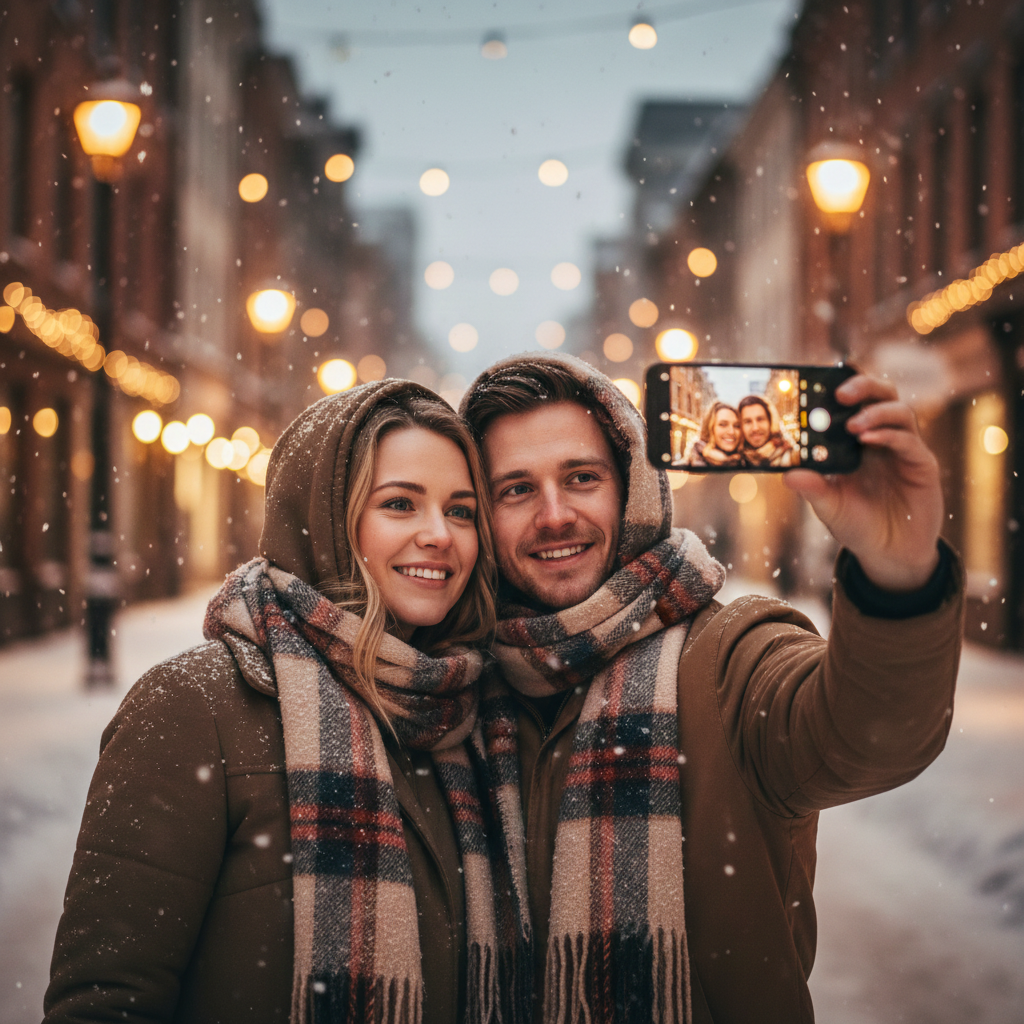 couple taking selfie in cozy winter street decorated with warm holiday lights